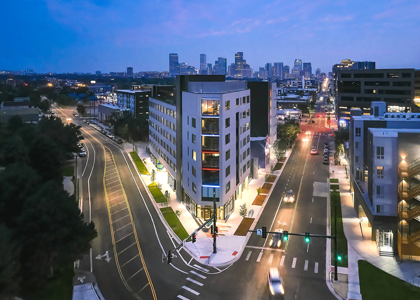 This 160-unit “aparthotel” building is located in Denver’s thriving RiNo neighborhood, offering uniquely flexible lengths of stay from a nightly to weekly option on several floors and a monthly to yearly option on others. Unit sizes range from 350 to 650 square feet, in studio and one-bedroom configurations. In addition, an existing historic home on the site will be preserved as an amenity to the guests and residents for group events and community gatherings. The project’s design was primarily driven by its unique site configuration, on the spearheaded point of a key intersection in the arts district. The architectural design for 3770 Walnut responds to RiNo’s industrial foundations as well as the modern housing and lifestyle needs of the Denver market.
