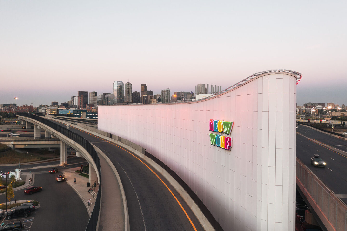 Our team quickly studied various site options in pursuit of creating a solution that would align with the mission of Meow Wolf while also future-proofing the vast site for its longer term development vision. The ultimate site selected for Meow Wolf Denver is bound by an interwoven web of surrounding highway infrastructure not only achieved those goals, but thrilled the entire team. The unusual land use sets a creative bar for future development in an area with multiple infrastructure constraints. The site’s parameters also set the stage for a unique, outward architectural expression.
