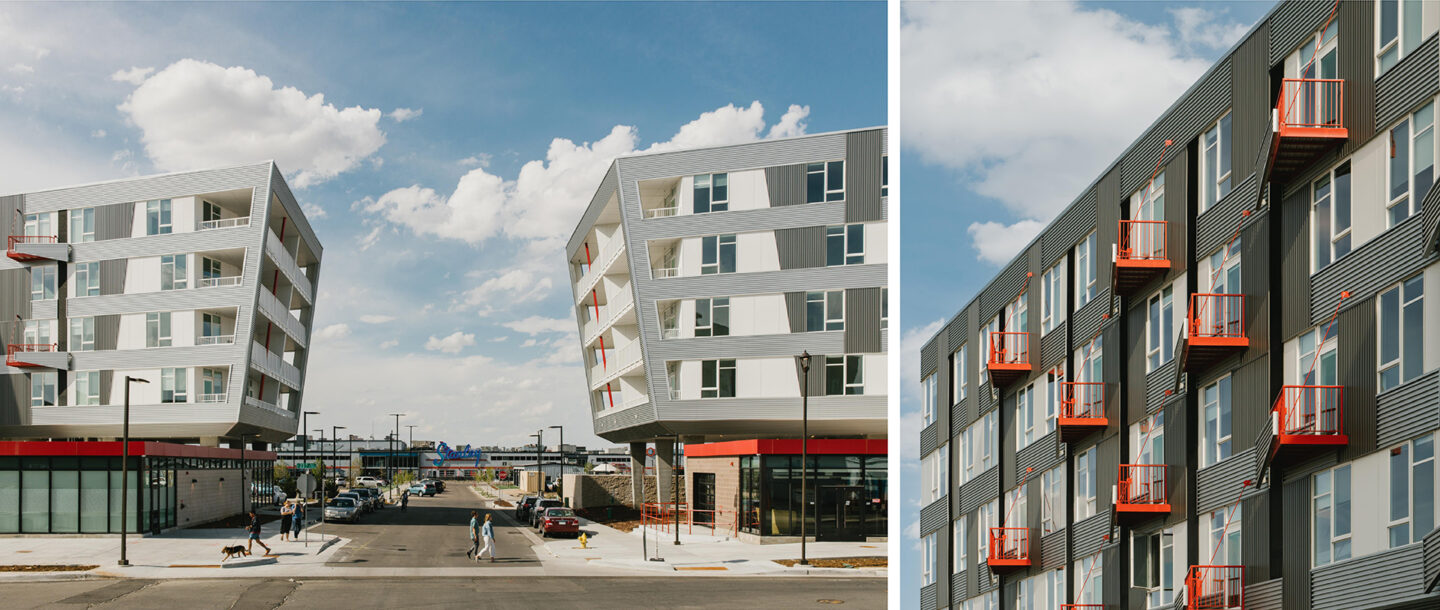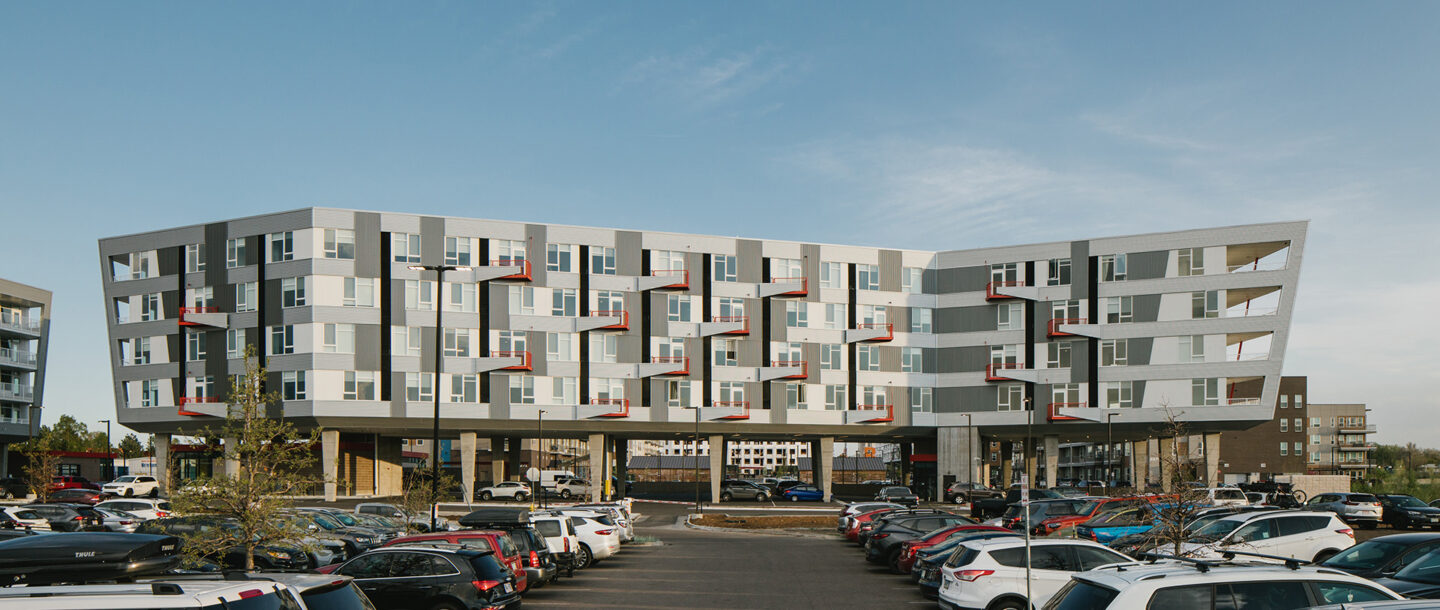 This 200+ unit housing complex is designed to sit adjacent to the recently-opened Stanley Marketplace food hall, a project that has achieved great success since opening in 2017. For the developers, this apartment project offered a great opportunity to set the tone for future development in the Aurora area. SAR+ spent a significant deal of time helping acclimate the Aurora City Planning team to the urban design elements of the project, the material choices reflective of the site’s aviation history, and the parking strategy embedded in the massing.